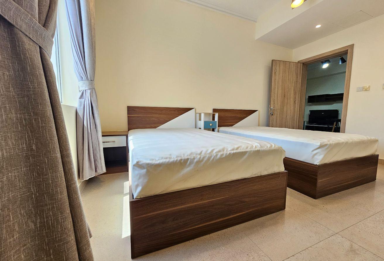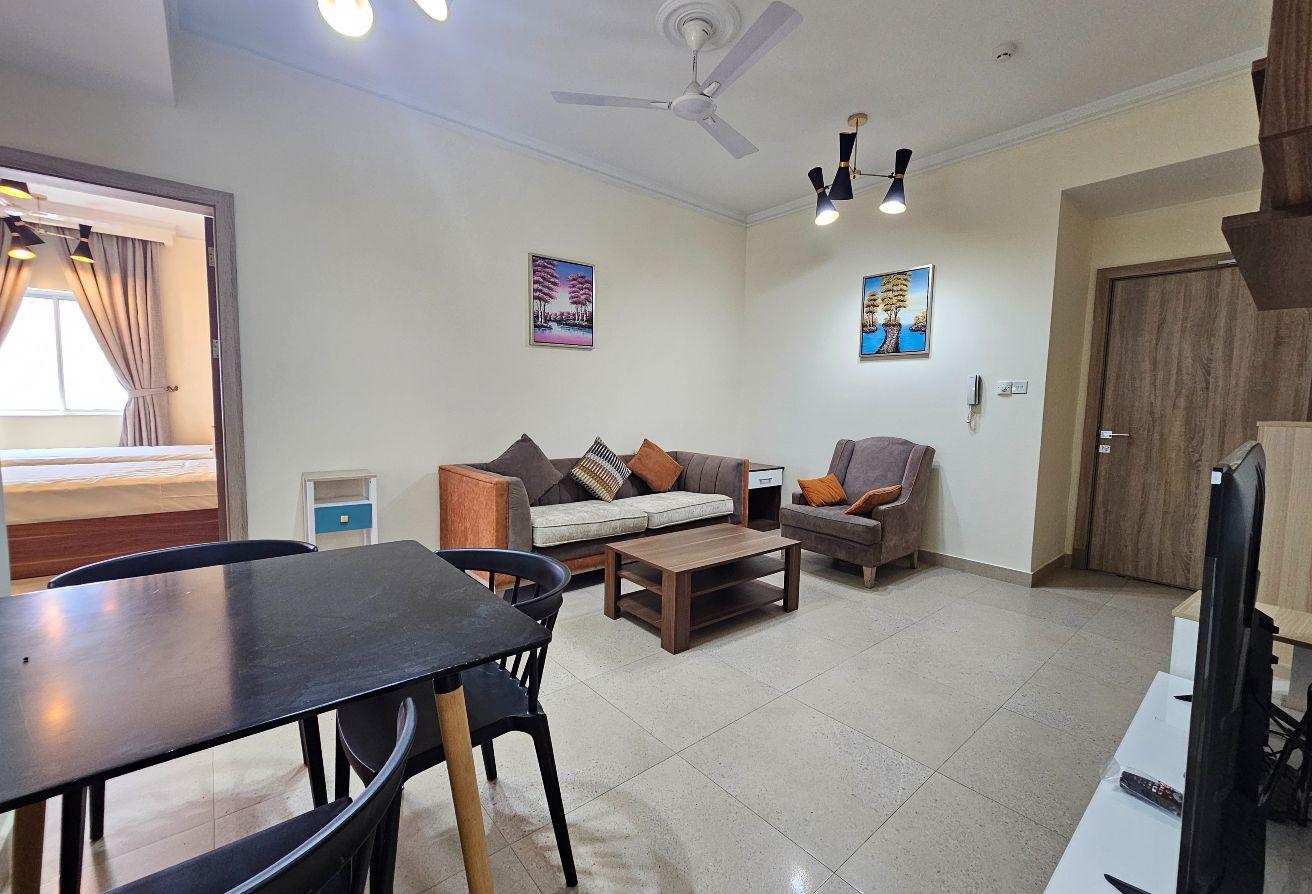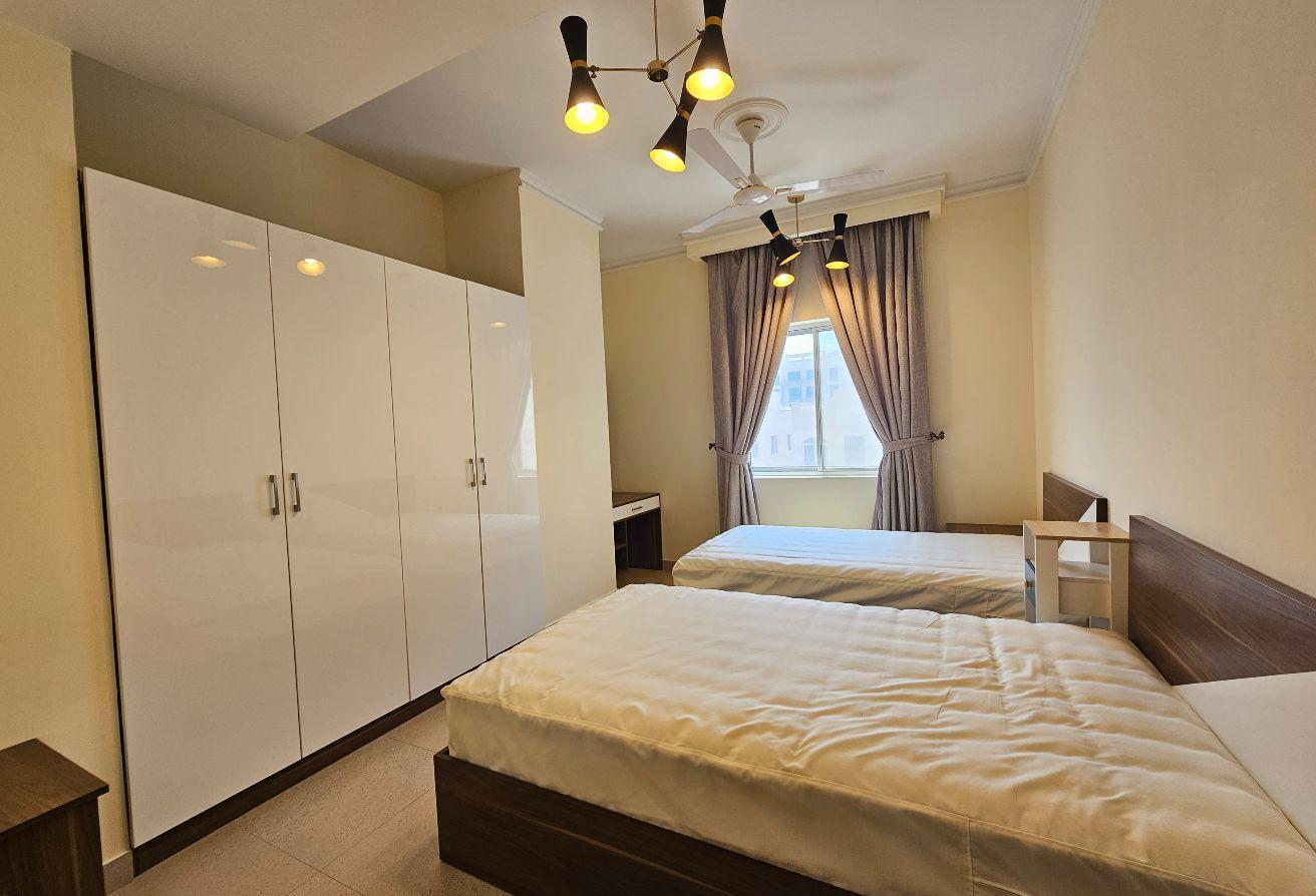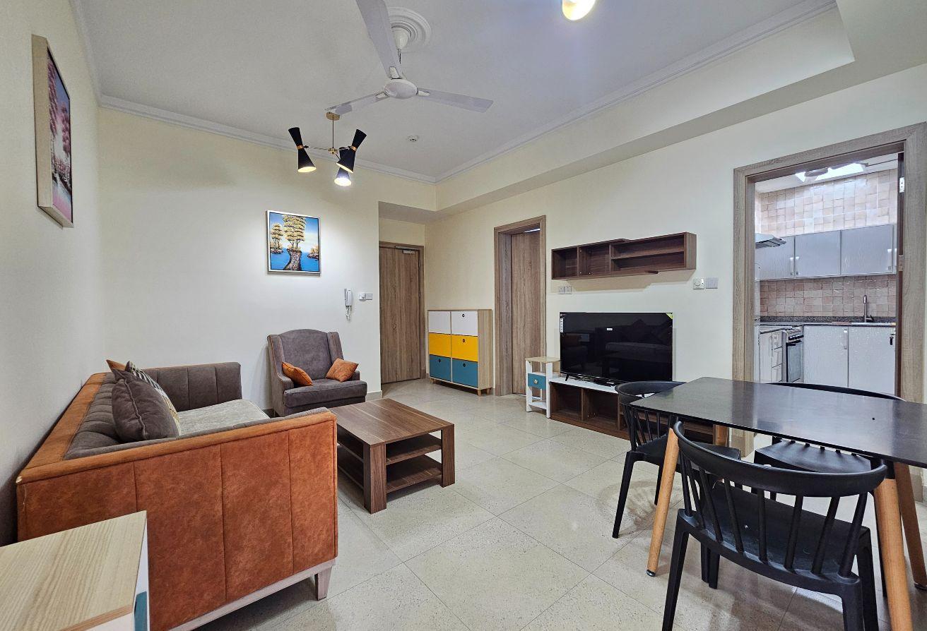 Seize this exceptional opportunity now! A newly renovated family-friendly apartment is available for rent in Um Al Hassam. It features spacious living and dining areas, 2 bedrooms, 2 bathrooms, a fully equipped kitchen, built-in wardrobes, and dedicated parking—everything included.