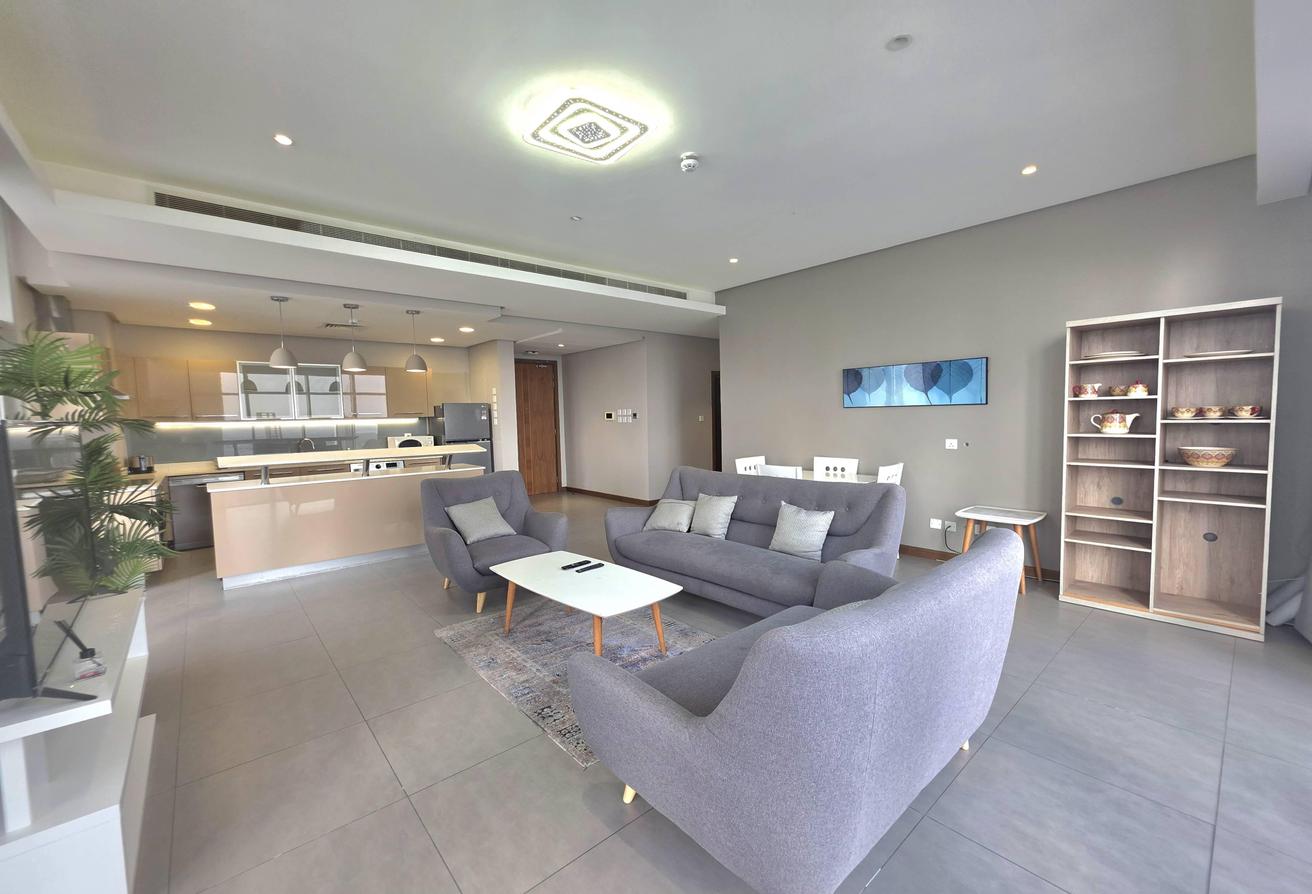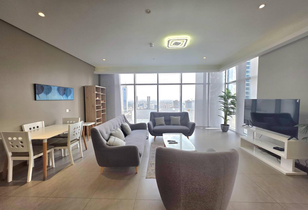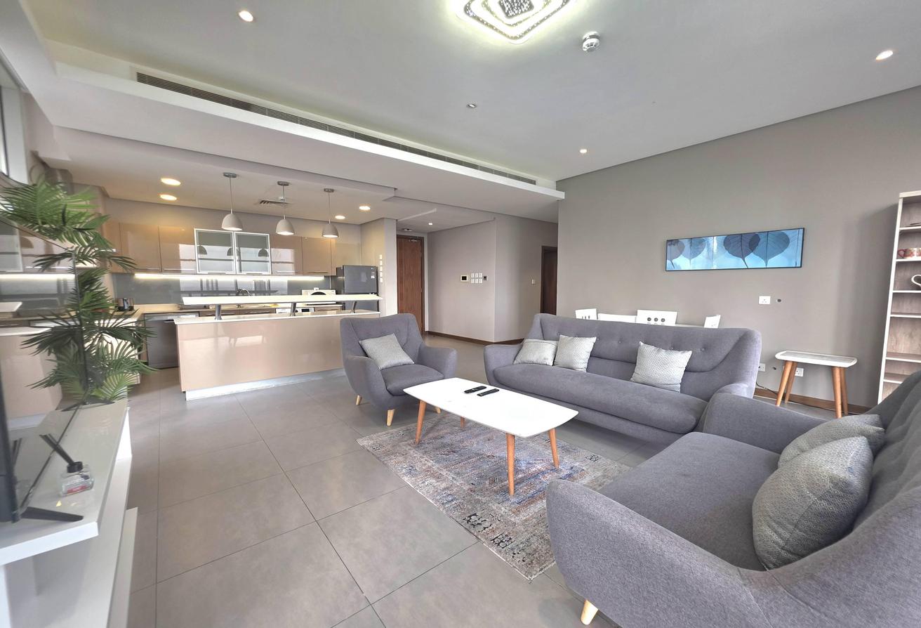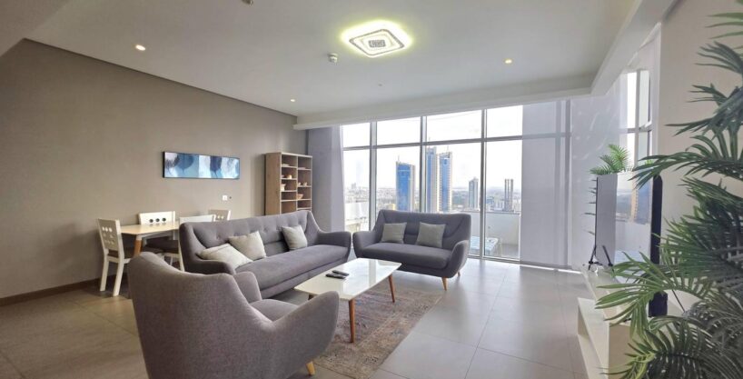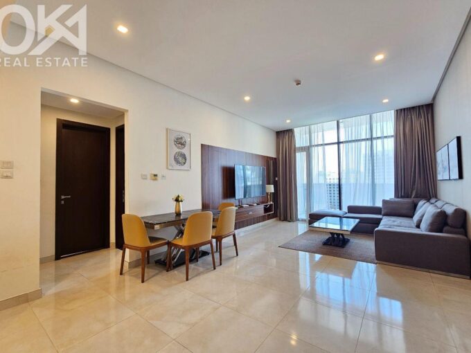 Enjoy refined urban living in this elegant two-bedroom apartment located in a prestigious residential tower in Seef. Designed with comfort and functionality in mind, the apartment features a modern layout with bright interiors and high-quality finishes, making it ideal for families or professionals seeking a premium lifestyle. The spacious living area is naturally well-lit and seamlessly connected to an open-plan kitchen that enhances everyday convenience. Both bedrooms offer comfort, privacy, and ample space, complemented by two well-finished bathrooms.