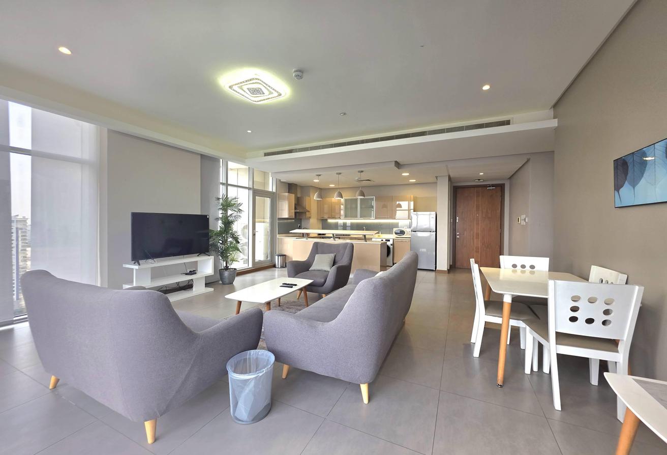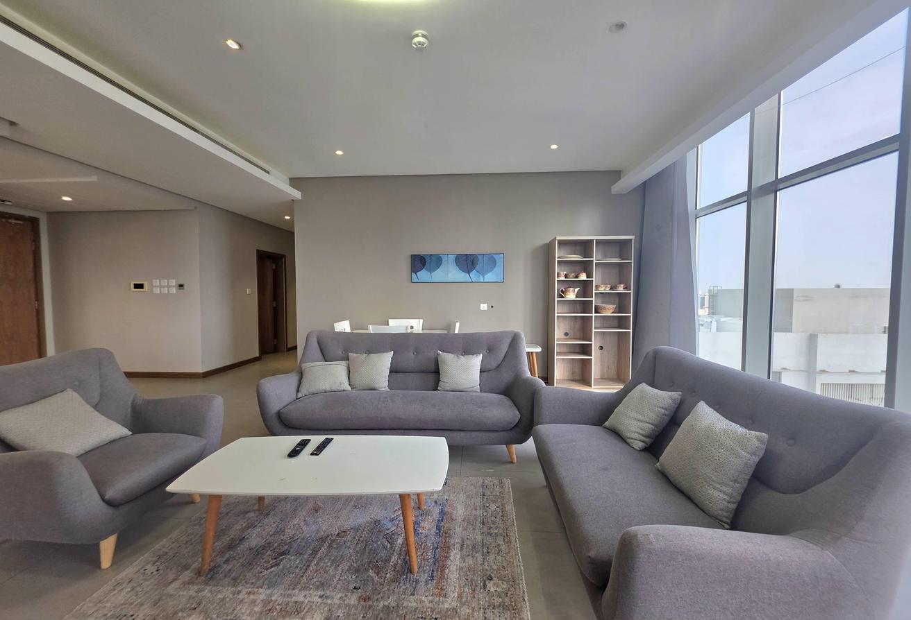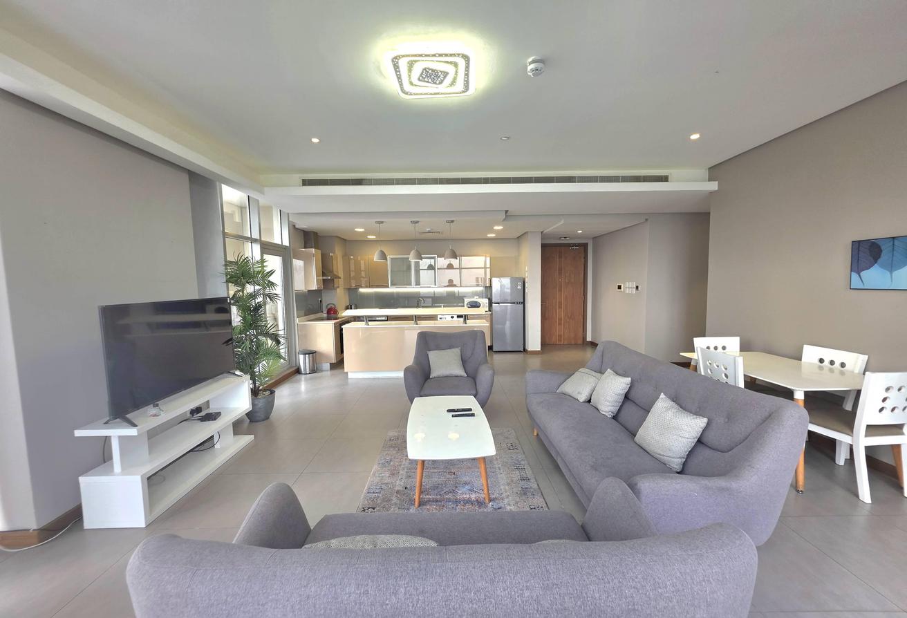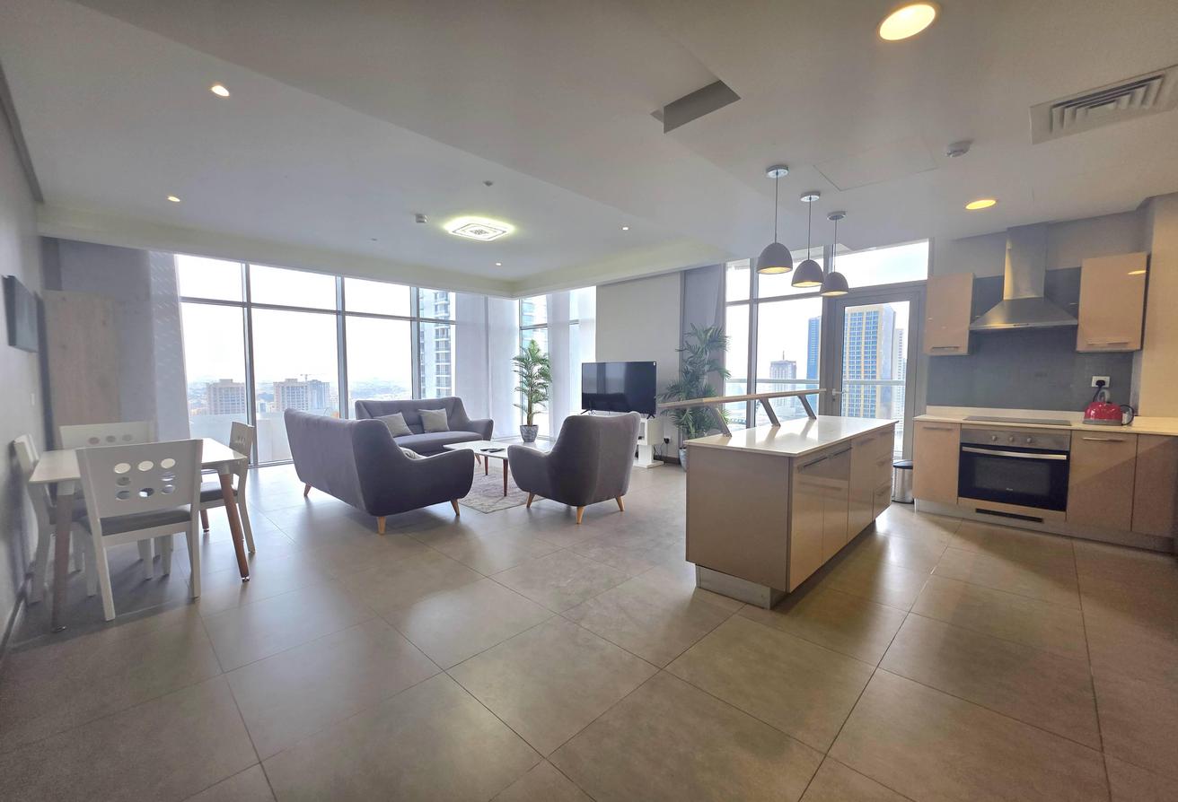 Enjoy refined urban living in this elegant two-bedroom apartment located in a prestigious residential tower in Seef. Designed with comfort and functionality in mind, the apartment features a modern layout with bright interiors and high-quality finishes, making it ideal for families or professionals seeking a premium lifestyle. The spacious living area is naturally well-lit and seamlessly connected to an open-plan kitchen that enhances everyday convenience. Both bedrooms offer comfort, privacy, and ample space, complemented by two well-finished bathrooms.