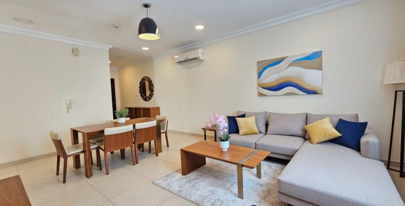 The apartment features **two generously sized bedrooms**, **two stylish modern bathrooms**, a **bright and spacious living room**, and an elegant dining area ideal for hosting and everyday living. The **contemporary kitchen** is fully equipped with a **gas stove**, quality appliances, and ample storage, while **high-speed Wi-Fi** ensures seamless connectivity throughout the home. Large windows allow abundant natural light, creating a calm and luxurious atmosphere. Located in a **family-friendly building**, it offers both security and comfort.