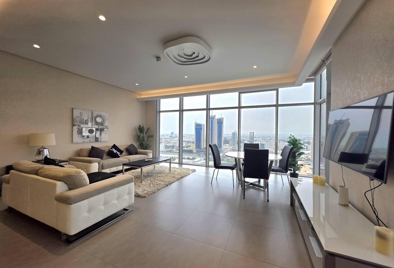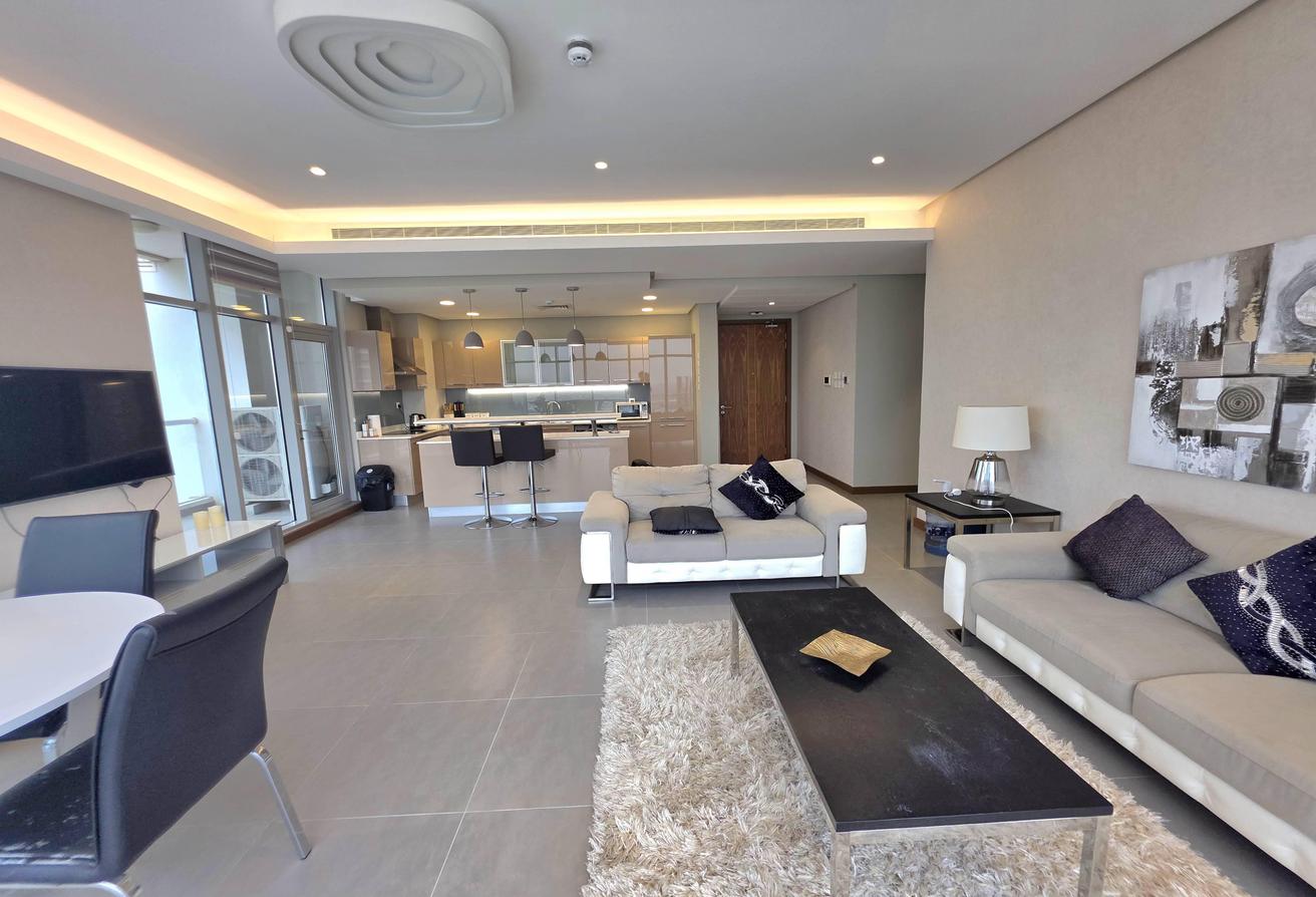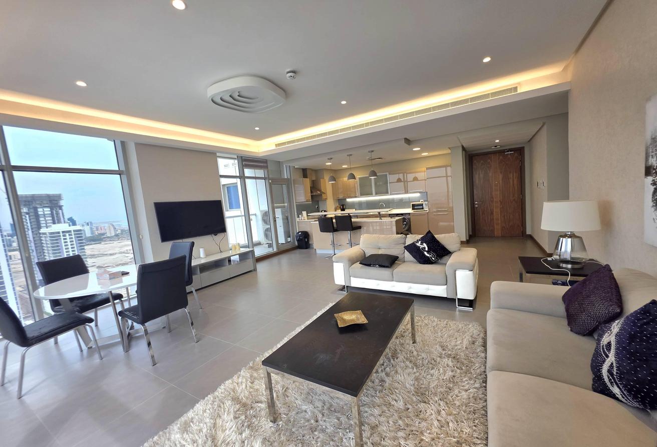 Enjoy refined urban living in this elegant two-bedroom apartment located in a prestigious residential tower in Seef. Designed with comfort and functionality in mind, the apartment features a modern layout with bright interiors and high-quality finishes, making it ideal for families or professionals seeking a premium lifestyle. The spacious living area is naturally well-lit and seamlessly connected to an open-plan kitchen that enhances everyday convenience. Both bedrooms offer comfort, privacy, and ample space, complemented by two well-finished bathrooms.