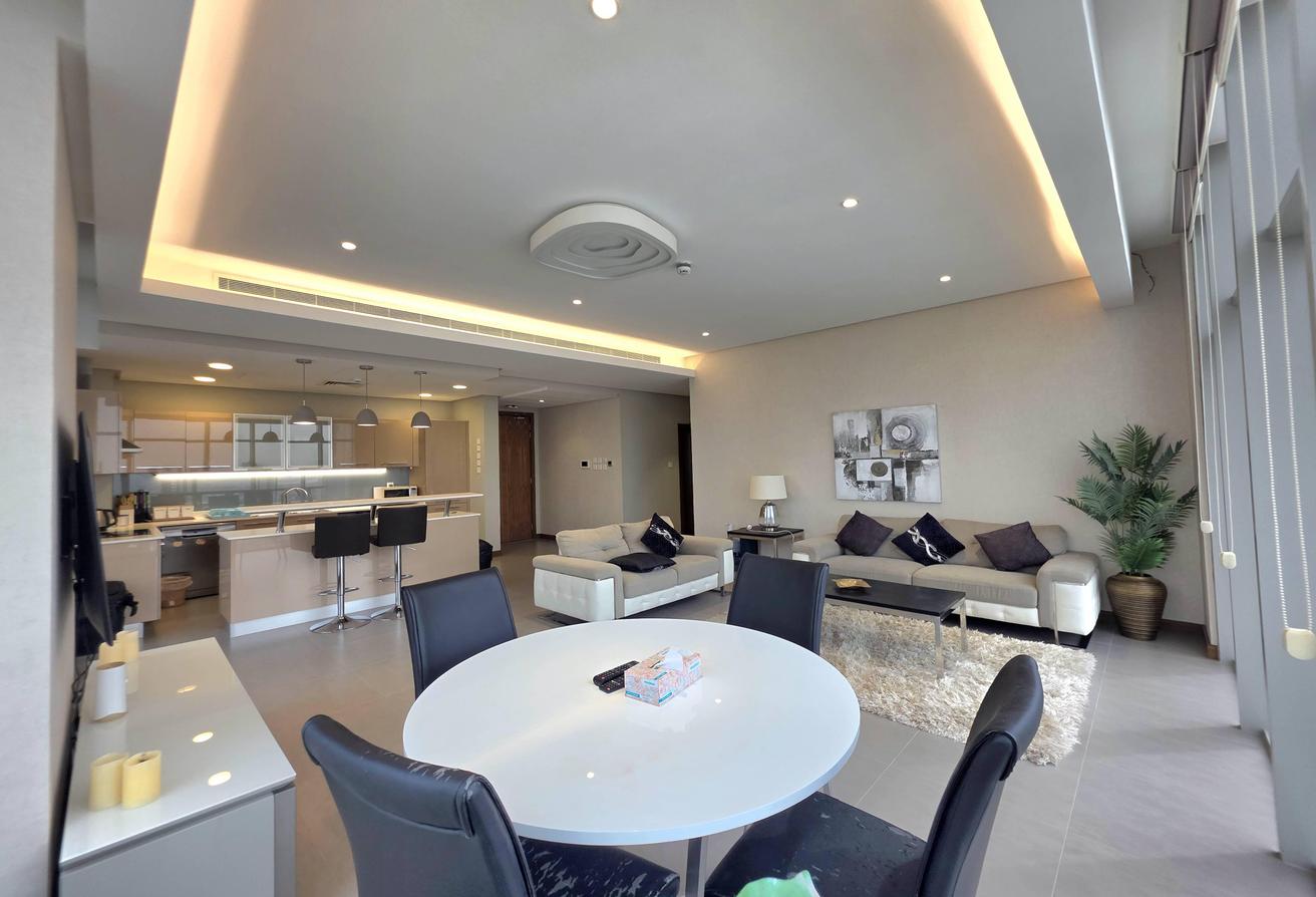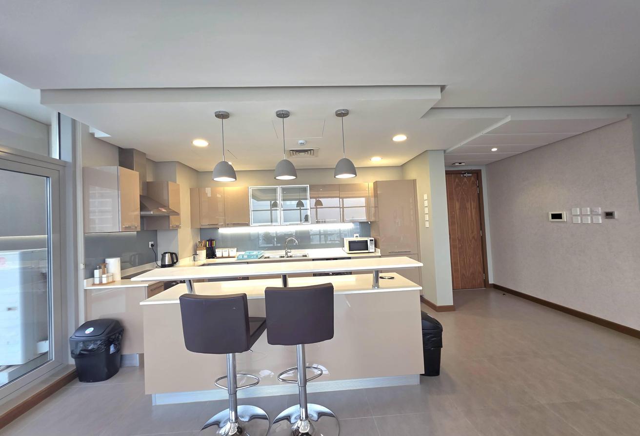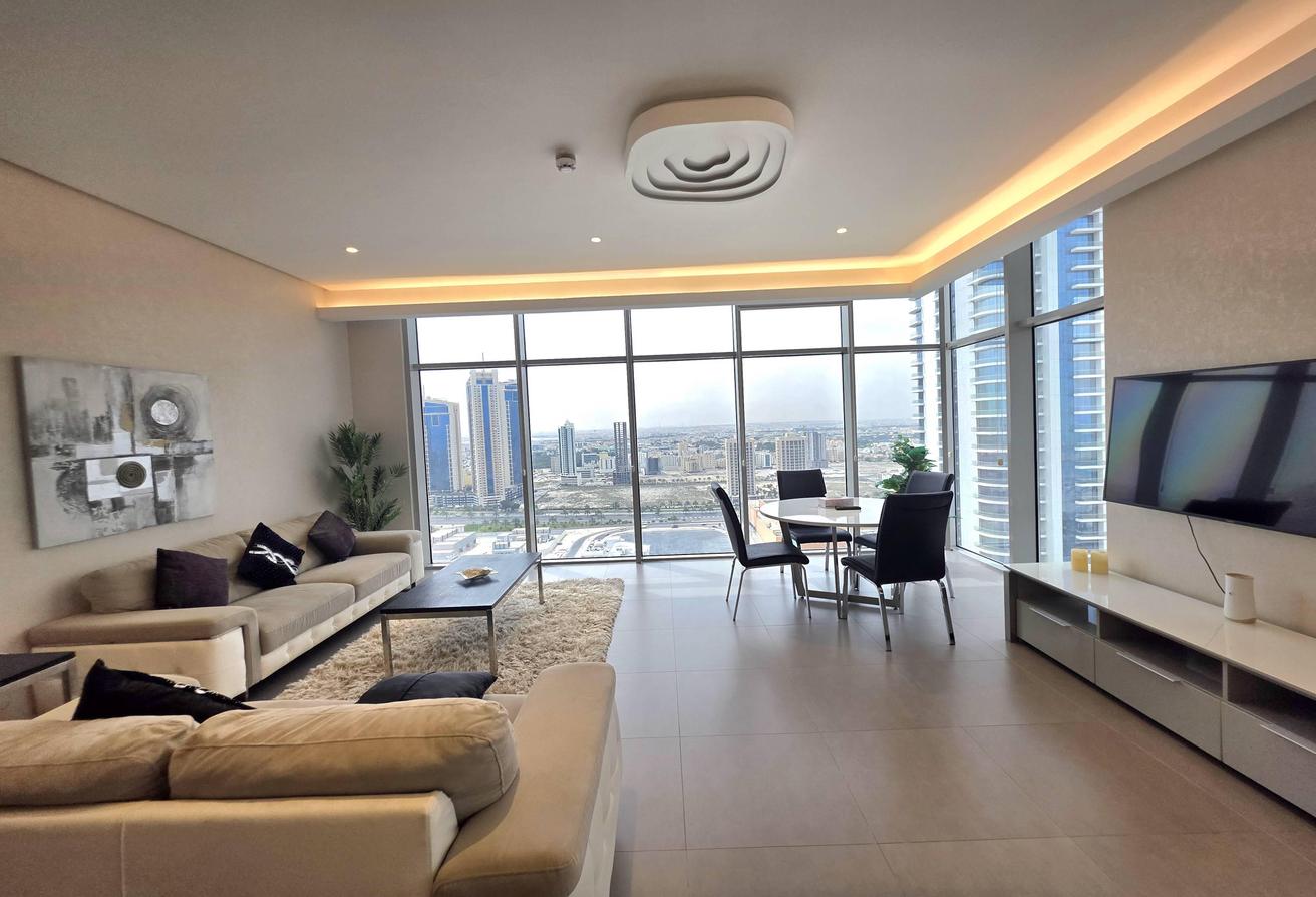 Enjoy refined urban living in this elegant two-bedroom apartment located in a prestigious residential tower in Seef. Designed with comfort and functionality in mind, the apartment features a modern layout with bright interiors and high-quality finishes, making it ideal for families or professionals seeking a premium lifestyle. The spacious living area is naturally well-lit and seamlessly connected to an open-plan kitchen that enhances everyday convenience. Both bedrooms offer comfort, privacy, and ample space, complemented by two well-finished bathrooms.