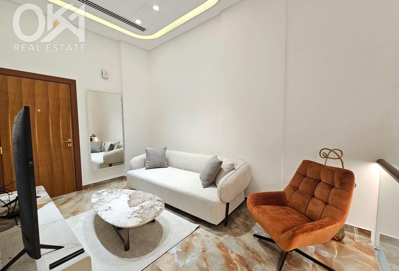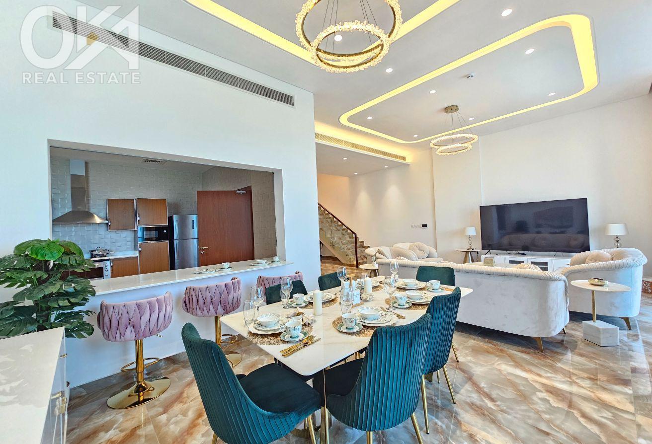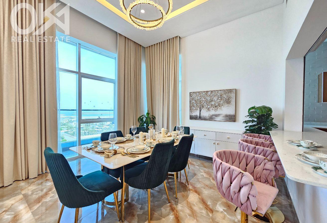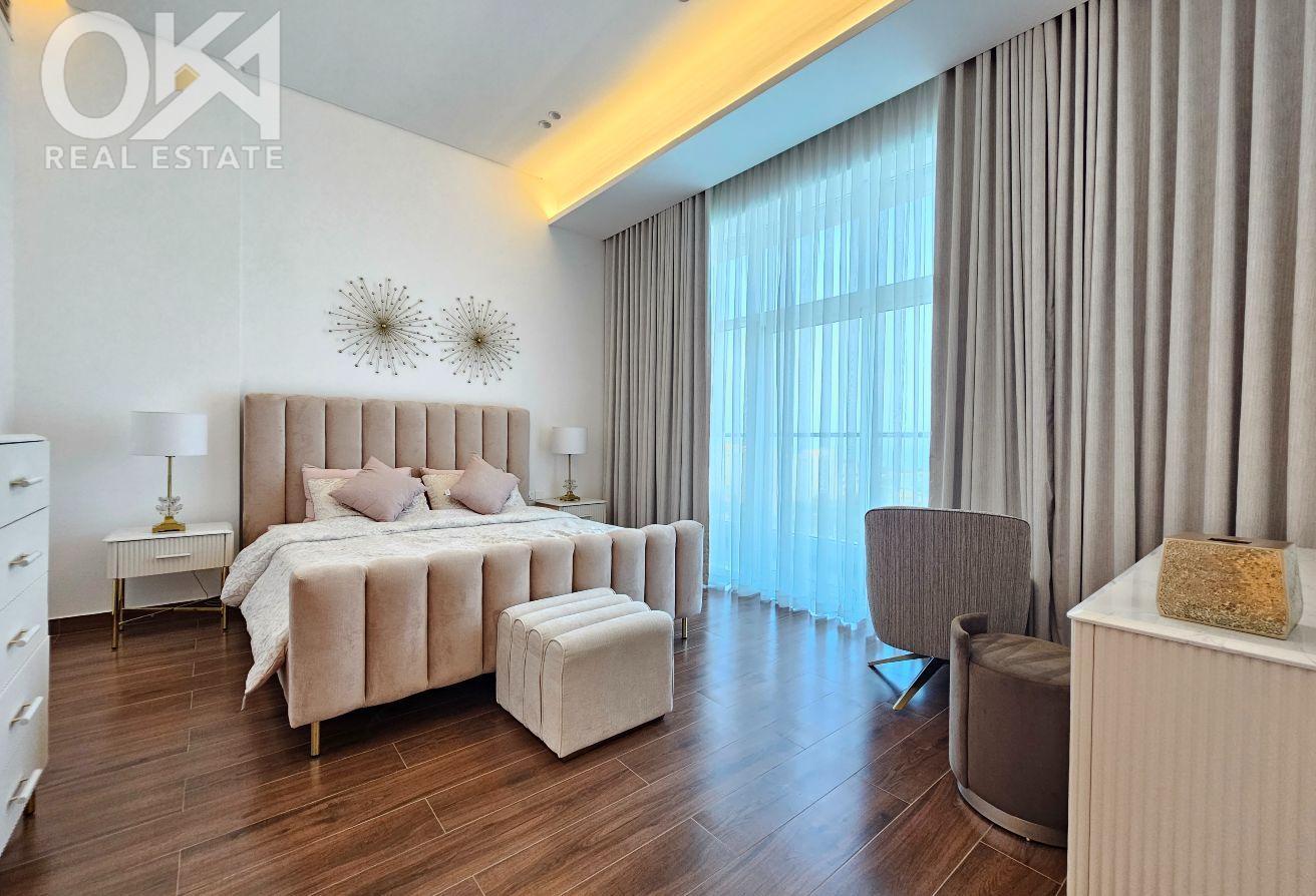 This luxurious duplex apartment for rent is in the peaceful, prestigious Seef area, close to the iconic Ritz-Carlton Resort. Fully furnished and thoughtfully designed for comfort and upscale living, it offers four spacious bedrooms, five modern bathrooms, a maid’s room, and two large living halls ideal for family living and entertaining. The closed kitchen is fully equipped with premium appliances and generous storage. Two large balconies offer uninterrupted sea views, letting in abundant natural light and creating a calm, relaxing atmosphere. The apartment features top-quality furniture and an advanced air purifier system, ensuring a clean, healthy indoor environment. With its generous layout and prime location, this duplex is a rare luxury offering in Seef.